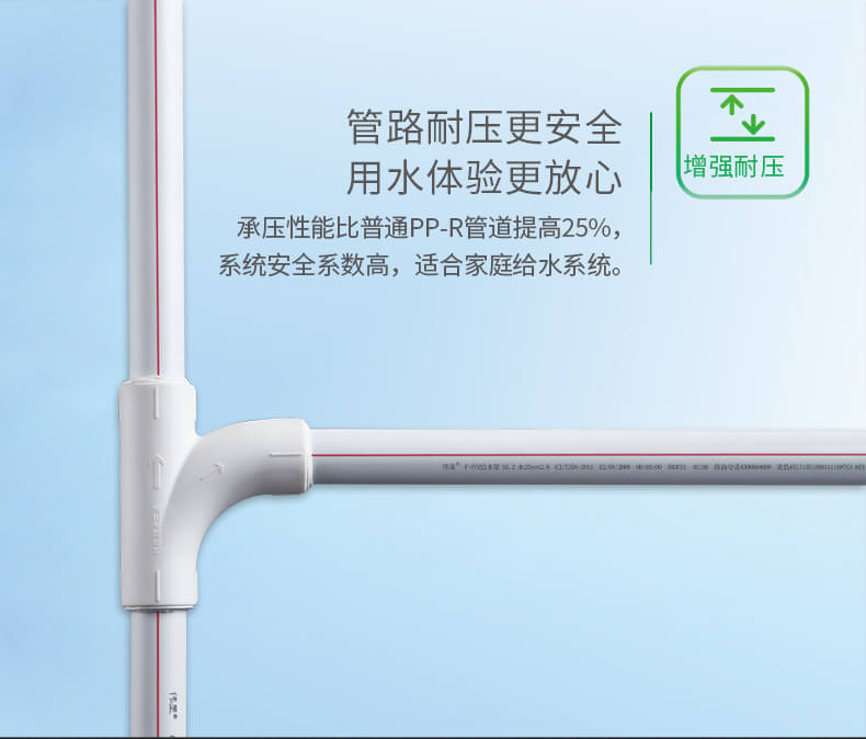 F-PPR给水管在原有PP-R的性能上,升级为三层结构,中间拥有纤维增强PP-R材料,具有高强度、高刚度、耐高温、低线性膨胀系数的性能优势,是家装水管推荐产品,更有“福管”注册商标,福管系列蓝色经典,福气到家。